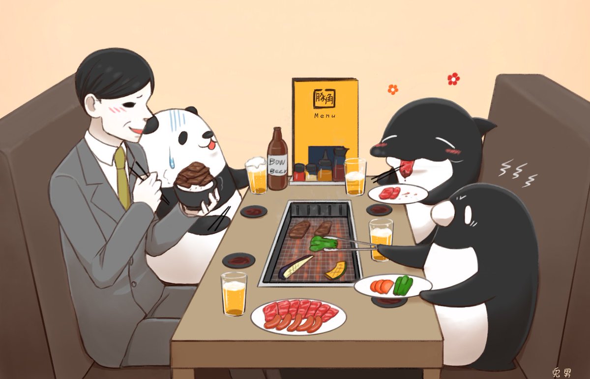 焼き肉を食べに来た某企画メンバー🍖🥩 🐧「ちゃんと野菜も食え!💢」 #テイペンED #テイペン魚拓