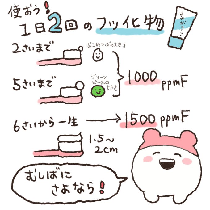 歯みがき粉の使い方が、海外に合わせて少し前にアップデートされました。 決まりを守って使えば、フッ化物は安全で効果的に虫歯を予防してくれるよ。 むし歯による人生の余計な苦しみを減らそう! 詳しく知りたい人は、厚生労働省のホームページをみてみよう♪ e-healthnet.mhlw.go.jp/information/te…