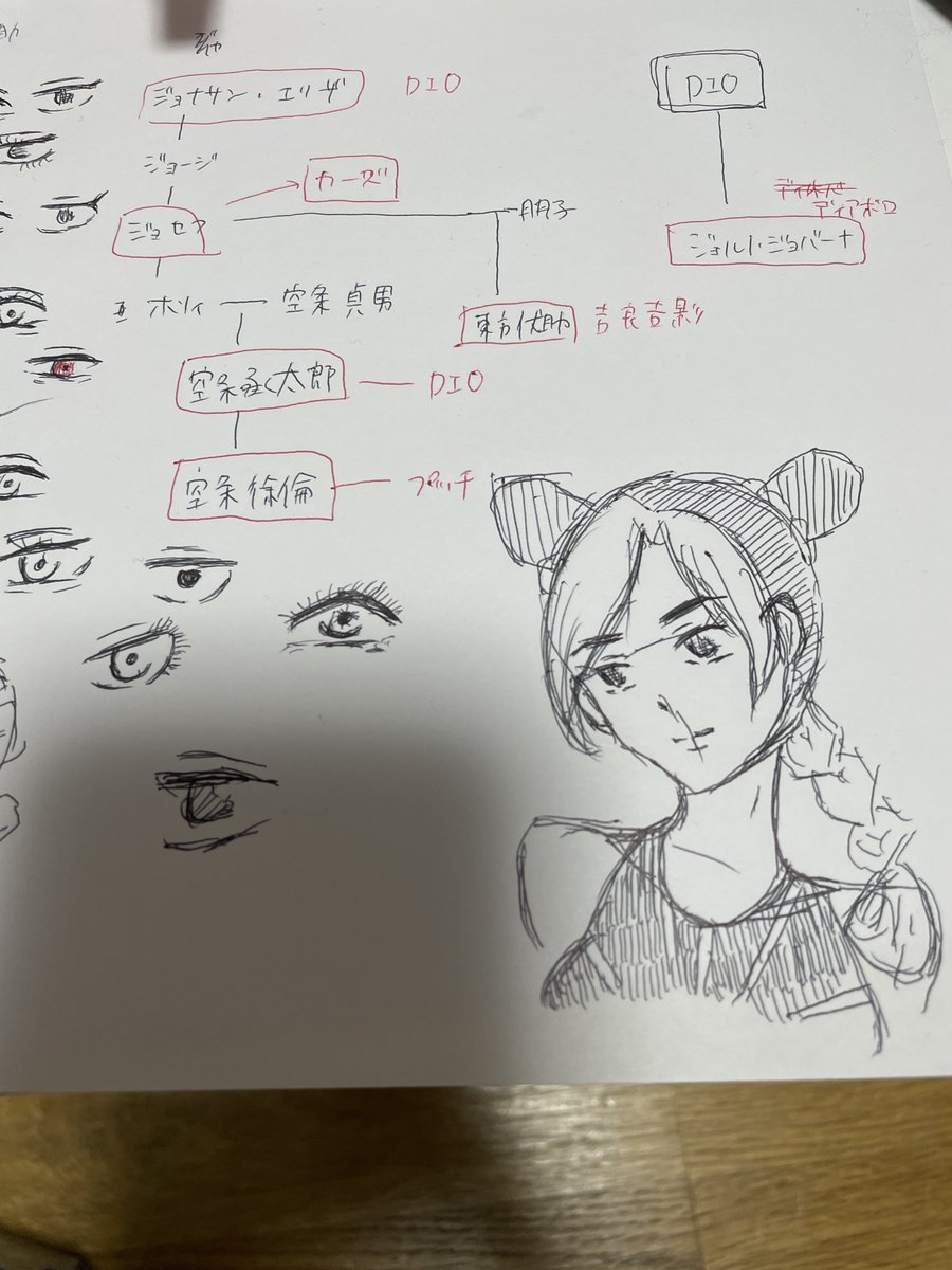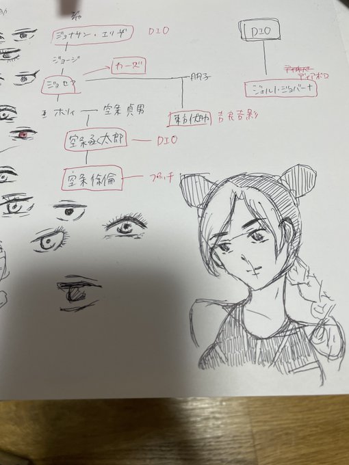 2 4 昨日るうちゃんに説明しながら書いてた家系図と落書きとたくさんの目 上の数字はジョジョのアニメの話数 23/05/03 14:51