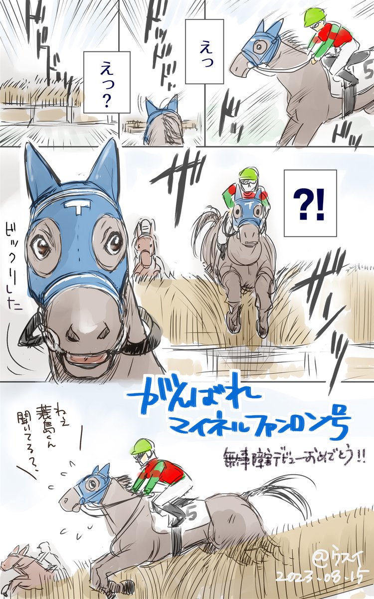 マイネルファンロン号 無事障害デビューおめでとうございます ・現地のお写真たくさん見られて嬉しかったです。ありがとうございます。 ・目線が前以外に向いてるように見えるショット多かったですね(笑) ・勢いなので、おかしいところはスルー&フィーリングで脳内補完よろしくどうぞ