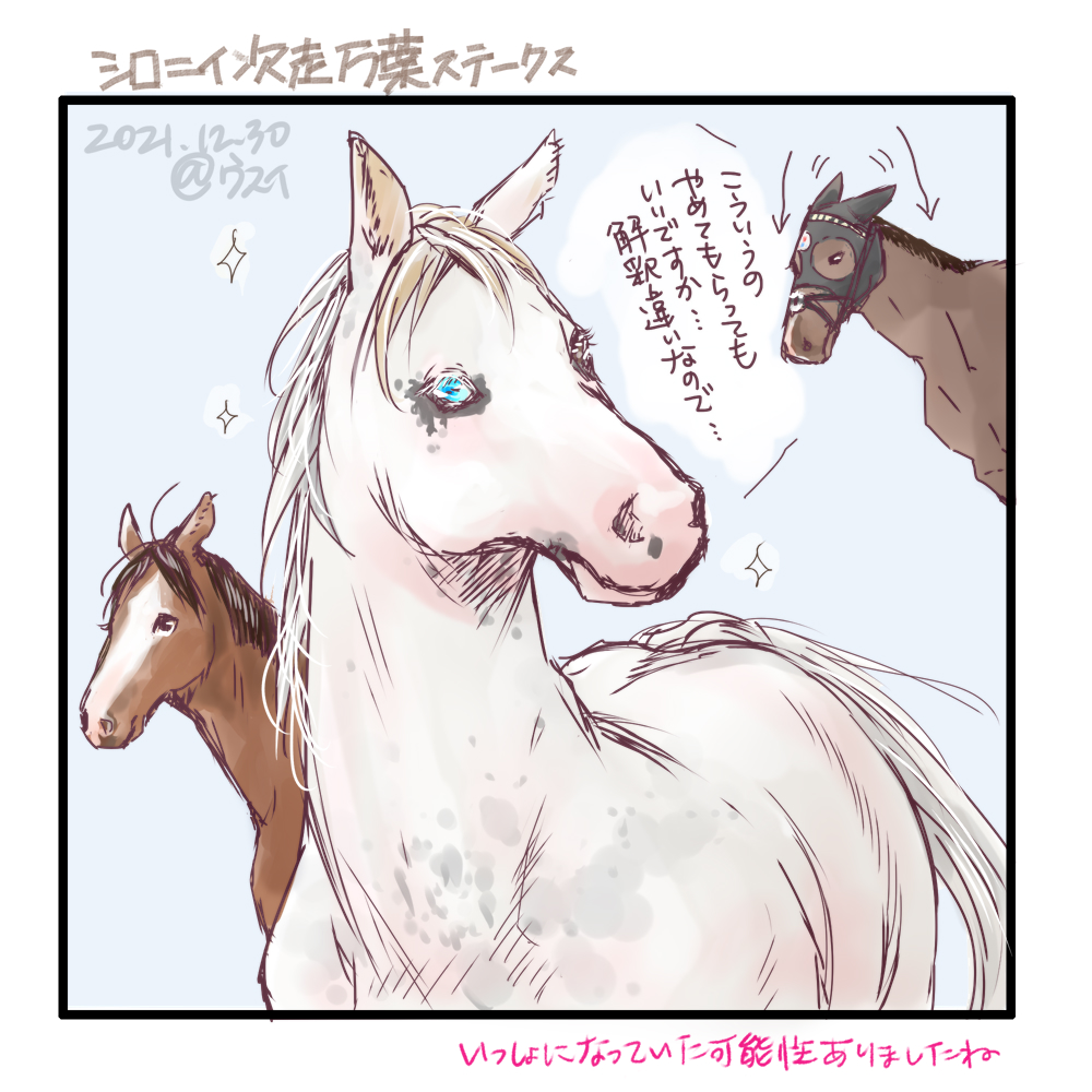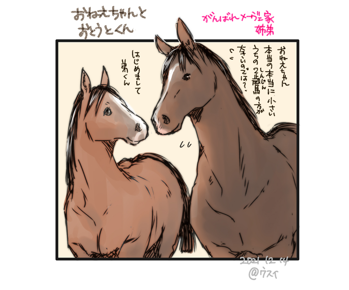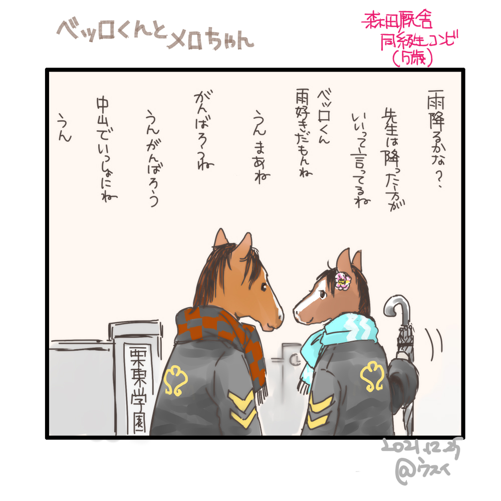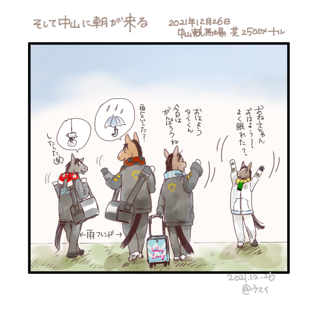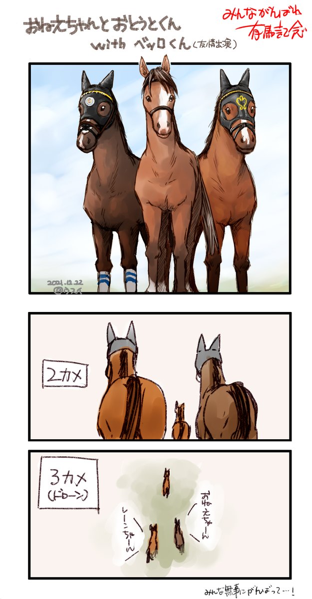 283 1017 すべての人馬が無事に。 そして良いレースとなりますように。 メロディーレーンちゃんとタイトルホルダーくんの姉弟。 モズベッロくんとメロディーレーンちゃんの森田コンビ。 モズベッロくんとステラヴェローチェくんの雨フレ(笑) みんながんばれ! 21/12/26 01:06