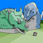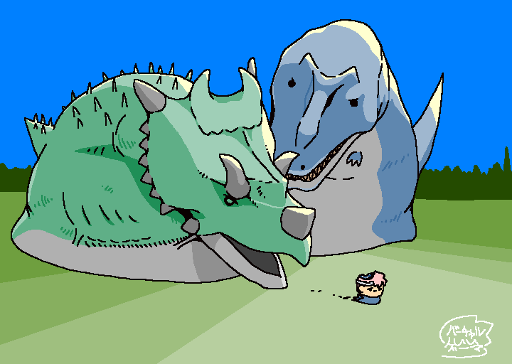 やりました。 ウスイさんのコミッション「ウスイ兄貴こんにちは。この度は白亜紀後期の北アメリカに生息していた肉食恐竜ゴルゴサウルスと植物食恐竜スピクリペウスが小競り合いしている絵をバチャい...」 skeb.jp/@usui_iigame/w… #Skeb #Commission @skeb_jpより