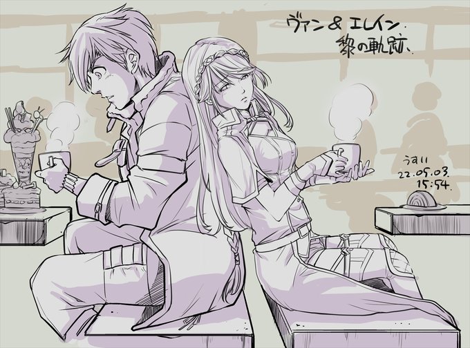 黎の軌跡よりヴァンとエレイン ~別々の席でお茶をしているのに背中にもたれかかってくるエレインと固まるヴァン~ってシチュエーション思いついたのに、背もたれ!邪魔!と不自然なベンチ型の喫茶店になった…(苦笑) #ファルゲーエアスケブ会2022 twitter.com/nakashimatai_p…