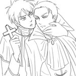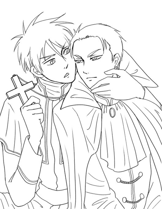 (進捗中)(フリート) 春大ハロウィン絵をアップしたくて頑張ってる。ナニを頑張ってるって…加藤!かとォーーー!なんか違う😹とりあえずもう少し加藤の線画に手を入れたら色塗りを…色塗りも苦手ーーー!!でも吸血鬼だいしゅけと牧師はるたん描きたいからがんばろう。。。