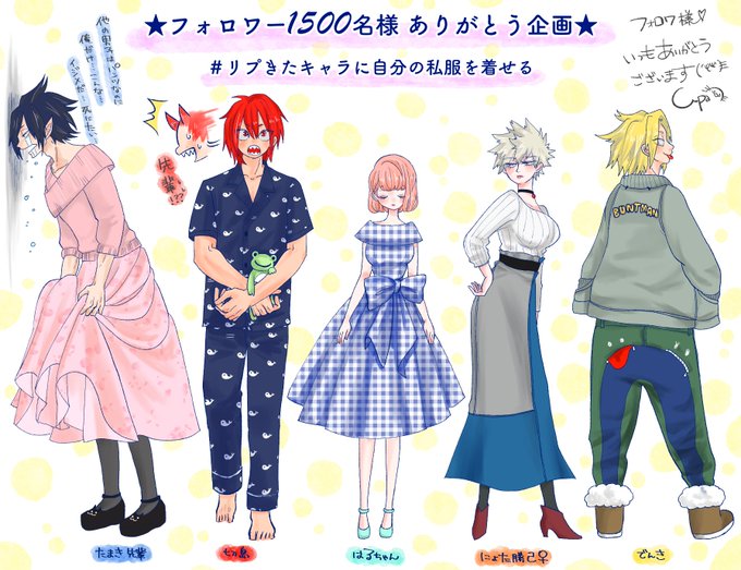 【感謝のご挨拶】 フォロワ1500名様をお迎えし、歓迎と感謝の気持ちを込めて以前募集したこの企画を描かせて頂きました✨ これからも仲良くして頂けたら幸いです♡ #リプきたキャラに自分の私服を着せる