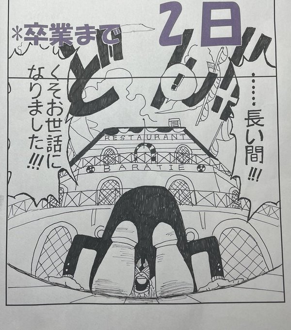 0 22 卒業前に描いたものです。他のコック達は時間がなくて、描けませんでした…#サンジ #ワンピース #模写 #ペン画 #イラスト #卒業 22/04/09 12:29
