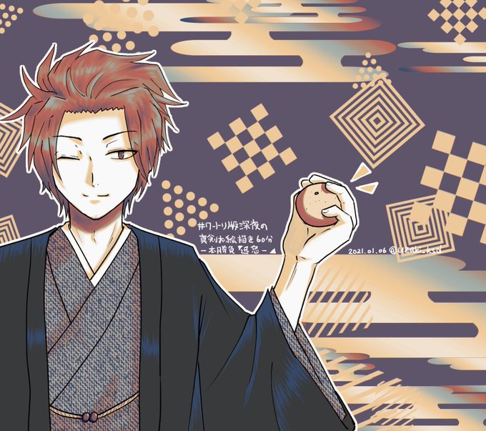 5 38 お題は【迅悠一】 新年なので着物で描かせて頂きました。+15分 手に持ってるのは三門みかんです^_^ #ワートリ版深夜の真剣お絵かき60分一本勝負 21/01/06 22:58