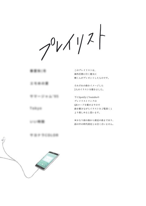 【イラスト本サンプル】2/2 pixiv.net/artworks/10128… 「プレイリスト」 憂太が海外任務に行く日、棘から送られてきた1通のメッセージには1つのプレイリストが添えられていた…。 1枚目のぼかしている部分には曲名を記載しています。 どんな曲があるのかはお手元に届いてからお楽しみください✨
