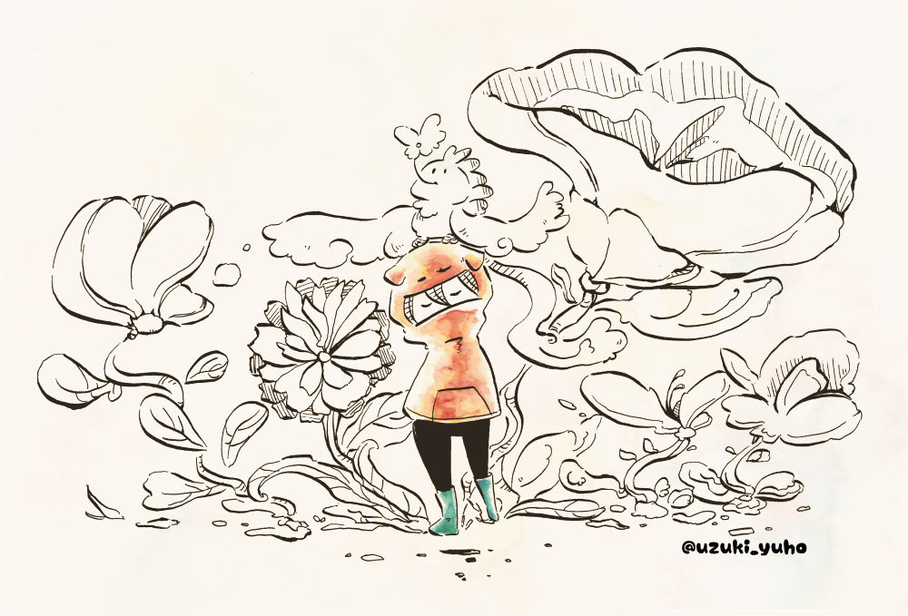 Yoshiさん(@0199_yoshi) 先の細いペンで描いたような細い線が得意な作家さんの内の1人です。私の写真の撮り方が下手なのでわかりにくいですが、人物の後ろに雲のようなもやっとしたグレーの陰が仕込んであります。大胆な余白の取り方が気持ちの良い作品です