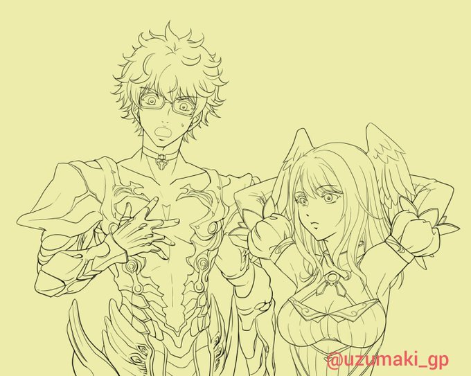 せっかく描いたけど漫画では薄くしちゃったのでここで供養したいシン(初描き)とアルレコを参考に元デザインの後ろの羽を足してみたタイオン(ノスタルジア) やっぱりバランス的にも羽あった方がかっこいいけど色々制限とかあったのかねぇ