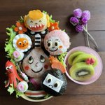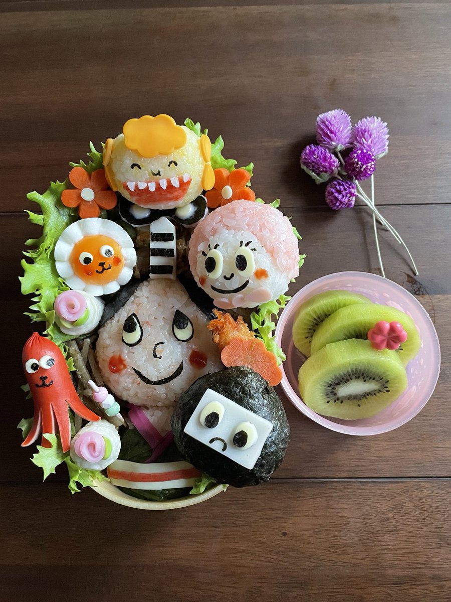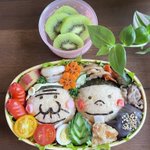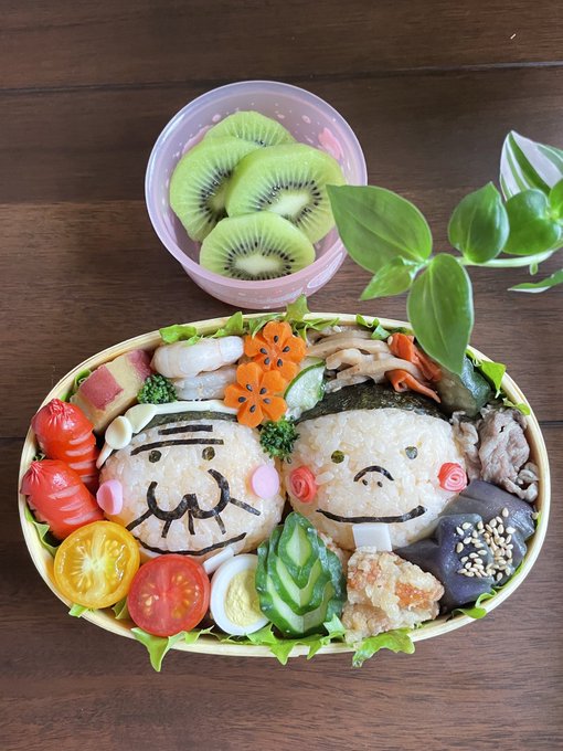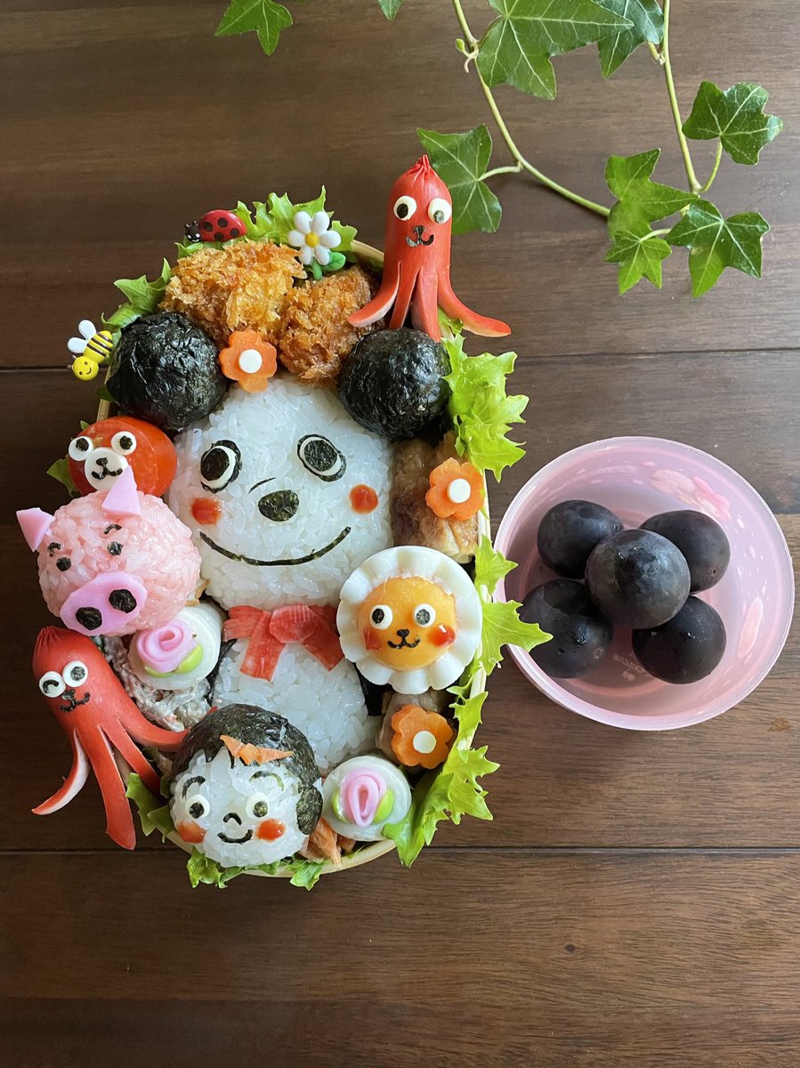 娘弁当🍱 🌸鳥の照り焼き 🌸カキフライ 🌸ごぼうサラダ 🌸人参胡麻和え 上野動物園のパンダをテレビで観て、可愛くて作りました🐼 パンダを囲む仲間たちです🐷 #OnigiriAction #パンダキャラ弁 #キャラ弁