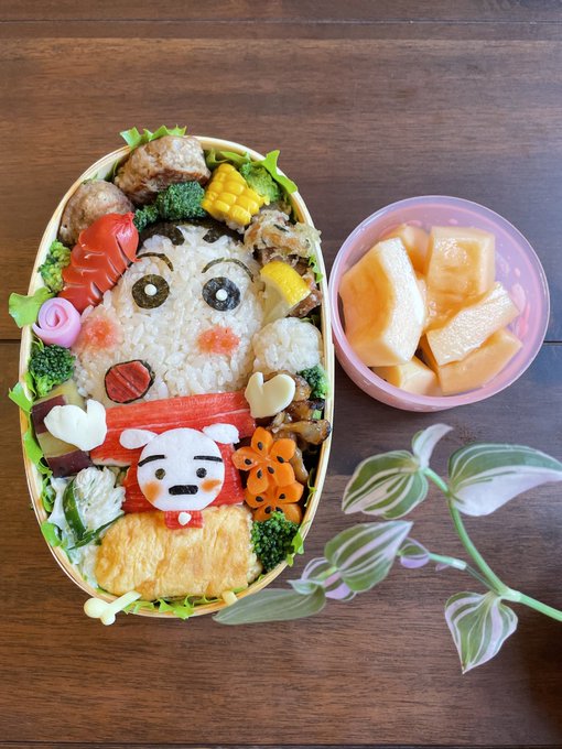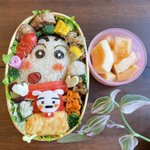 娘弁当🍱 🌸ちくわの磯辺揚げ 🌸焼き鳥 🌸ハンバーグ(ニチレイ) 🌸ささみサラダ 春日部のヒーロー #クレヨンしんちゃん とシロ 『成せば成る、洗えば食える何物も』↑しんちゃんの名言😂笑笑