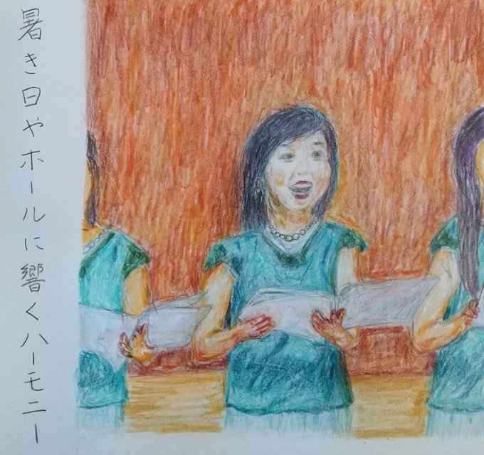 3 162 暑き日やホールに響くハーモニー コロナ禍で中止になっていた区の合唱祭が三年振りに開催された。どの グループも歌声が伸びやかで楽しさに満ちていた。この二年間、合唱なんてとんでもないと練習場確保も大変だったと聞く。そのため解散に追い込まれたグループもあった #色鉛筆俳画 #色鉛筆画 #俳句 22/08/19 14:56