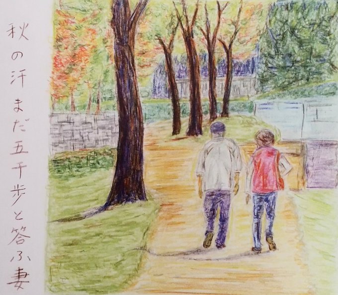 秋の汗まだ五千歩と答ふ妻 休みの日は、近くの公園をウォーキングしています。 妻の歩く速度が速く、私は汗をかきかき歩いています。 #色鉛筆俳画 #俳画 #色鉛筆画 #俳句 #自費出版本