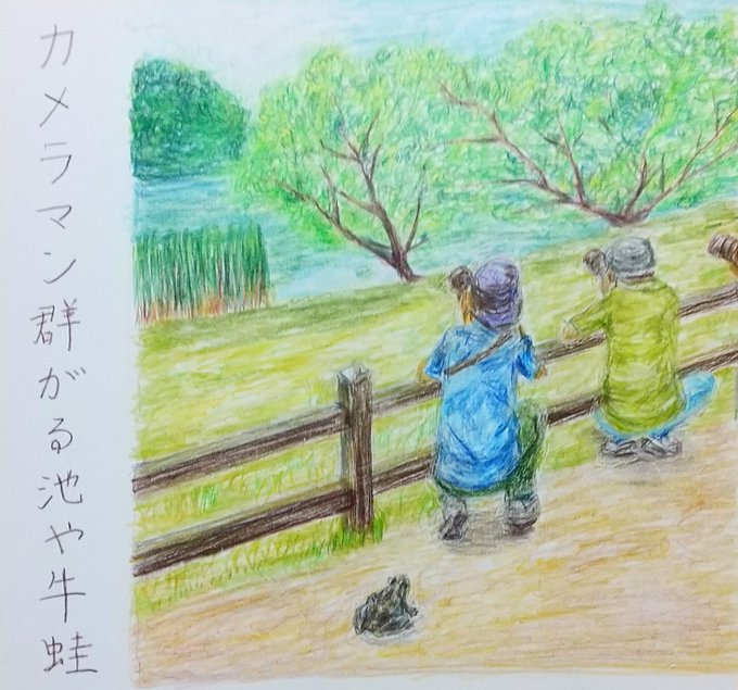 カメラマン群がる池や牛蛙 カワセミ(翡翠)が池の魚を取る瞬間を撮ろうと多くのカメラマンが池の周りに陣取ります。決定的瞬間には、一斉にシャッター音がなり、その時牛蛙がびっくりしてか、「ブォーブォー」と鳴きます。 牛蛙は姿を見せませんので想像で描きました。 #色鉛筆俳画 #色鉛筆画 #俳句