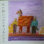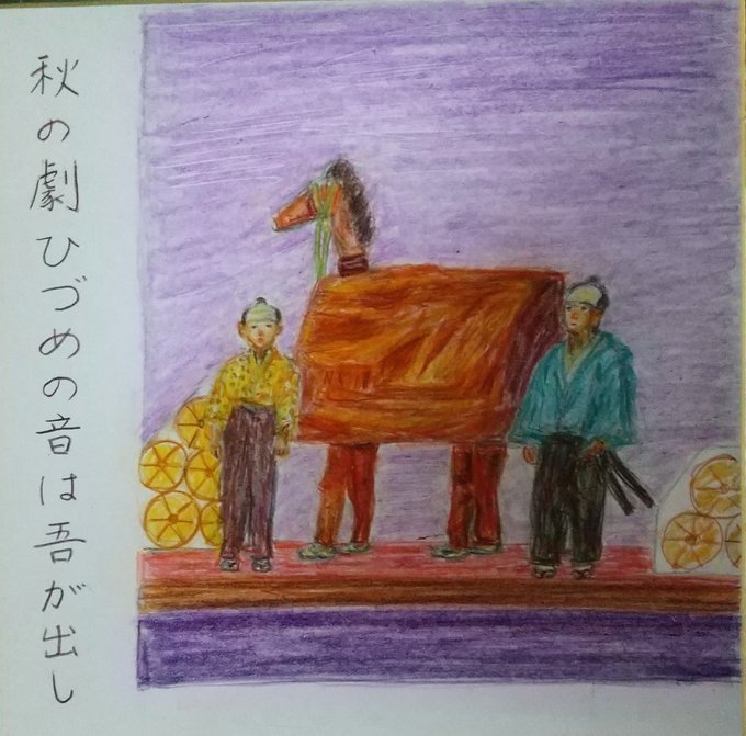 秋の劇ひづめの音は吾が出し 学芸会の思い出です。 昔話の劇で、K君と私は裏方の効果音の担当です。私が馬の蹄の音、K君が鶯の音色です。 遅く迄練習しました。 本番の終幕で、出演者が舞台に勢揃いし馬役の生徒も顔出ししましたが、裏方のK君と私は呼ばれませんでした😂 #色鉛筆俳画 #色鉛筆画 #俳句