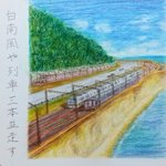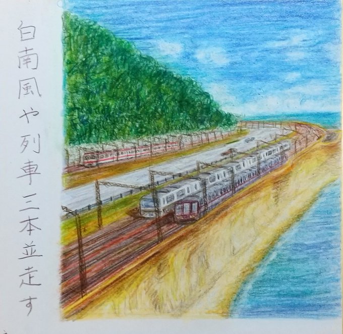 7 156 白南風や列車三本並走す 神戸市の塩屋海岸は、山がかなり接近しています。海岸沿いに、JRの山陽本線の複々線と山陽電車の複線と国道二号線が通っています。ある夏の日、JRに乗っていると、すぐ横に新快速電車、道路を挟んで山陽電車が並走していました。ワクワクしました #色鉛筆俳画 #色鉛筆画 #俳句 22/10/09 16:40