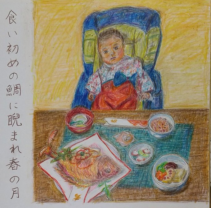 0 148 食い初めの鯛に睨まれ春の月 お食い初めは生後百日前後に一生食べることに困らないように と子の健やかな成長を願って行う行事です。長生きの験担ぎで夜に行うこともあるとのことです。俳句は鯛に睨まれ(見守られ)、春の月に見守られているとの思いを込めて詠みました #色鉛筆俳画 #色鉛筆画 #俳句 22/10/22 14:12