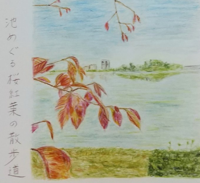3 143 過去の色鉛筆俳画 (俳句) 池めぐる桜紅葉の散歩道 (色鉛筆画) 別途添付 #色鉛筆俳画 #色鉛筆画 #俳句 #紅葉 22/10/29 18:51