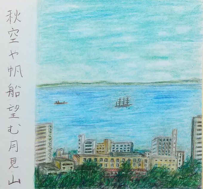 6 151 秋空や帆船望む月見山 源氏物語須磨の巻の基調となった在原行平が、須磨に蟄居されていた時に、月を見るために度々訪れた裏山が月見山です。良く晴れた日、月見山から須磨海岸を望むと神戸港を出航した帆船が沖をゆっくり進んでいました。 #色鉛筆俳画 #色鉛筆画 #俳句 #源氏物語 #月見山 #在原行平 22/10/30 19:50