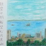 秋空や帆船望む月見山 源氏物語須磨の巻の基調となった在原行平が、須磨に蟄居されていた時に、月を見るために度々訪れた裏山が月見山です。良く晴れた日、月見山から須磨海岸を望むと神戸港を出航した帆船が沖をゆっくり進んでいました。 #色鉛筆俳画 #色鉛筆画 #俳句 #源氏物語 #月見山 #在原行平