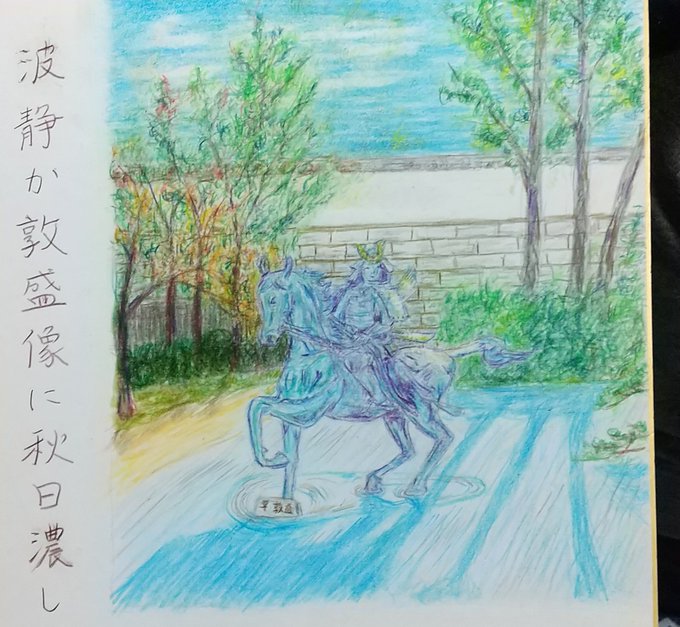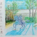 4 151 波静か敦盛像に秋日濃し 須磨寺の庭に、平家物語が伝える史話である一ノ谷の戦いの中の平敦盛と熊谷直実の一騎討ちの場面を再現した銅像があります。討ち取られた敦盛の首は、この須磨寺に首塚として祀られ、胴体は須磨浦公園に胴塚として祀られています。 #色鉛筆俳画 #色鉛筆画 #俳句 #平家物語 22/11/05 17:16