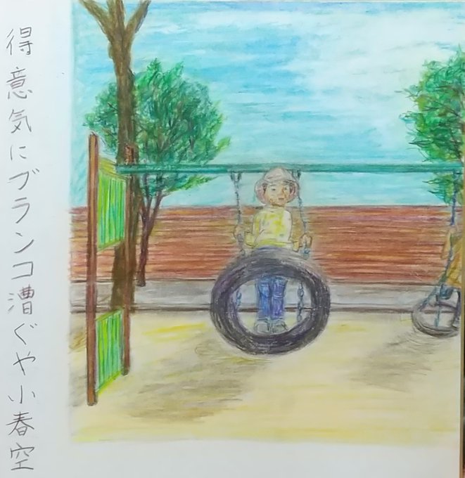 7 173 得意気にブランコ漕ぐや小春空 初冬の暖かい日、孫の通う幼稚園で祖父母参観日がありました。いつもはよそよそしい孫ですが、この日は、じいじ·ばあばにいいところを見せようと、いつもは座って漕いでいるブランコを、得意気に立って漕いでいる様子を披露してくれました #色鉛筆俳画 #色鉛筆画 #俳句 22/11/20 15:43
