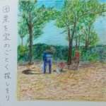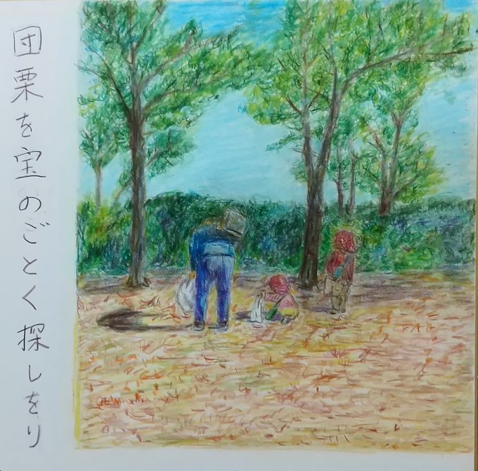 団栗を宝のごとく探しをり 園児が団栗を見つけ、宝物をみつけたように先生に嬉しそうに見せていました。幼い頃は周りの物がキラキラ輝いていました。段々歳をとるとその輝きが減っていきます。紅葉を見ても、要らなくなった葉っぱをリストラしていると思ってしまいます #色鉛筆俳画 #色鉛筆画 #俳句