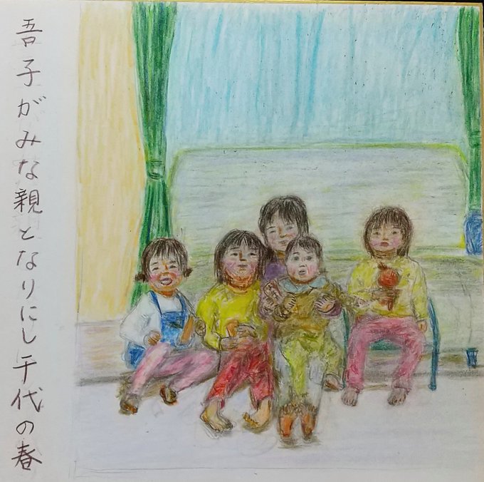 吾子がみな親となりにし千代の春 子は皆結婚し、次男に二人、三男に二人、そして長男に昨年子が生まれました。家族十三人が集う正月は賑やかでした。一昔前にはあちこちの家庭で見られた光景です。昨今は少子化と言われ平凡が平凡でなくなったおかしな時代になりました #色鉛筆俳画 #俳画 #色鉛筆画