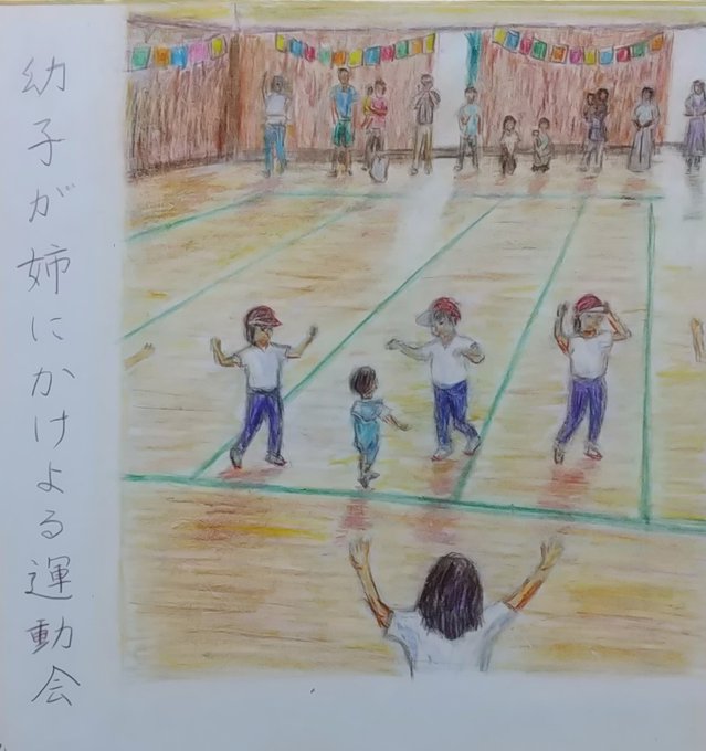 2 152 *秋の句 幼子が姉にかけよる運動会 幼稚園の運動会は、小さな妹や弟も親と一緒に見にきています。初めのうちはおとなしく姉や兄のお遊戯・かけっこを見ていますが、次第に退屈してきてそこら辺りをうろうろします。私の孫娘もお姉ちゃんに嬉しそうに駆け寄っていました #色鉛筆俳画 #色鉛筆画 #俳句 22/12/30 18:55