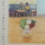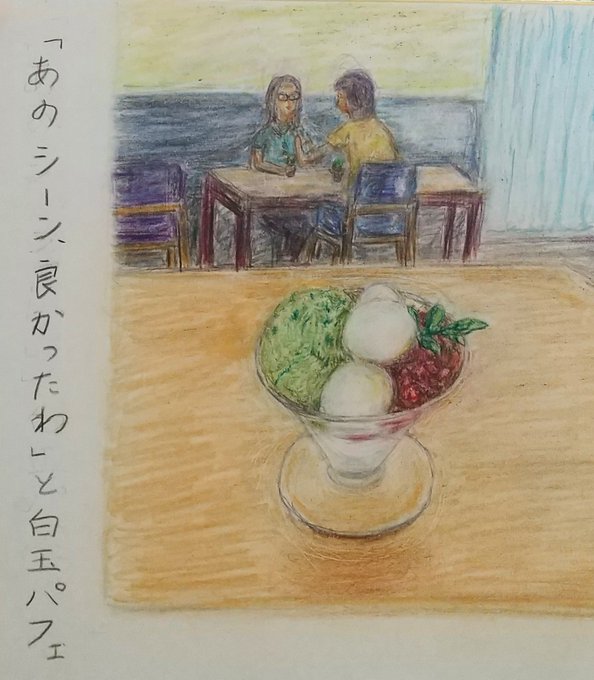 前掲の俳句を修正しました 「あのシーン、良かったわ」と白玉パフェ 気の置けない相手と映画を観ての帰り、映画の感想などを喋りながら、好きな物を食べるって、凄く贅沢で幸せなことだと思います。私は妻と映画の帰り、白玉抹茶パフェを食べます🎵白玉は夏の季語です #色鉛筆俳画 #色鉛筆画 #俳句