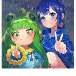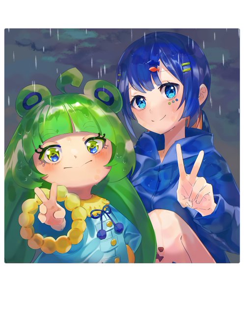 #スイちゃんとツーショット t.tさん宅のカエルノちゃんと雨の中ツーショット!☔ 雨の中でもたのしいもんね!😊💖 #絵描きさんと繋がりたい ラフから色塗りまで約4時間半、配信で描きました! アーカイブも残ってるのでメイキング見たい方はぜひに💖