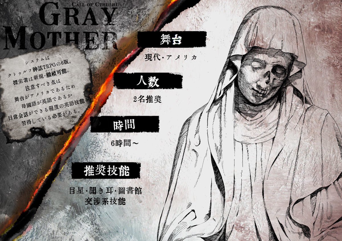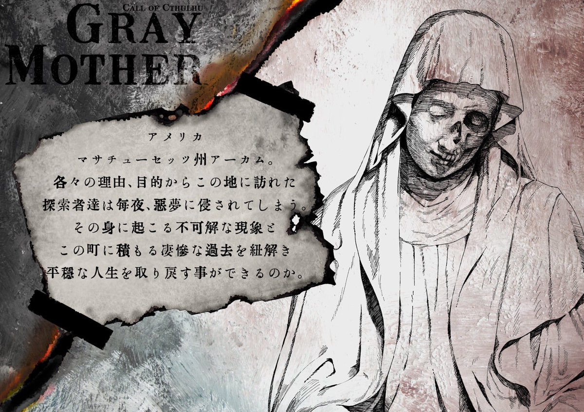 | CoC6版 | ♱ GRAY MOTHER ♱ 魔女狩りを題材にしたシナリオ。 現代アメリカ、アーカムの地を訪れた探索者だったが、未だ残る魔女の嘆の渦に巻き込まれてしまう──。 ※制作中のシナリオです。 目標4月公開。 ケツ叩きにトレーラー公開