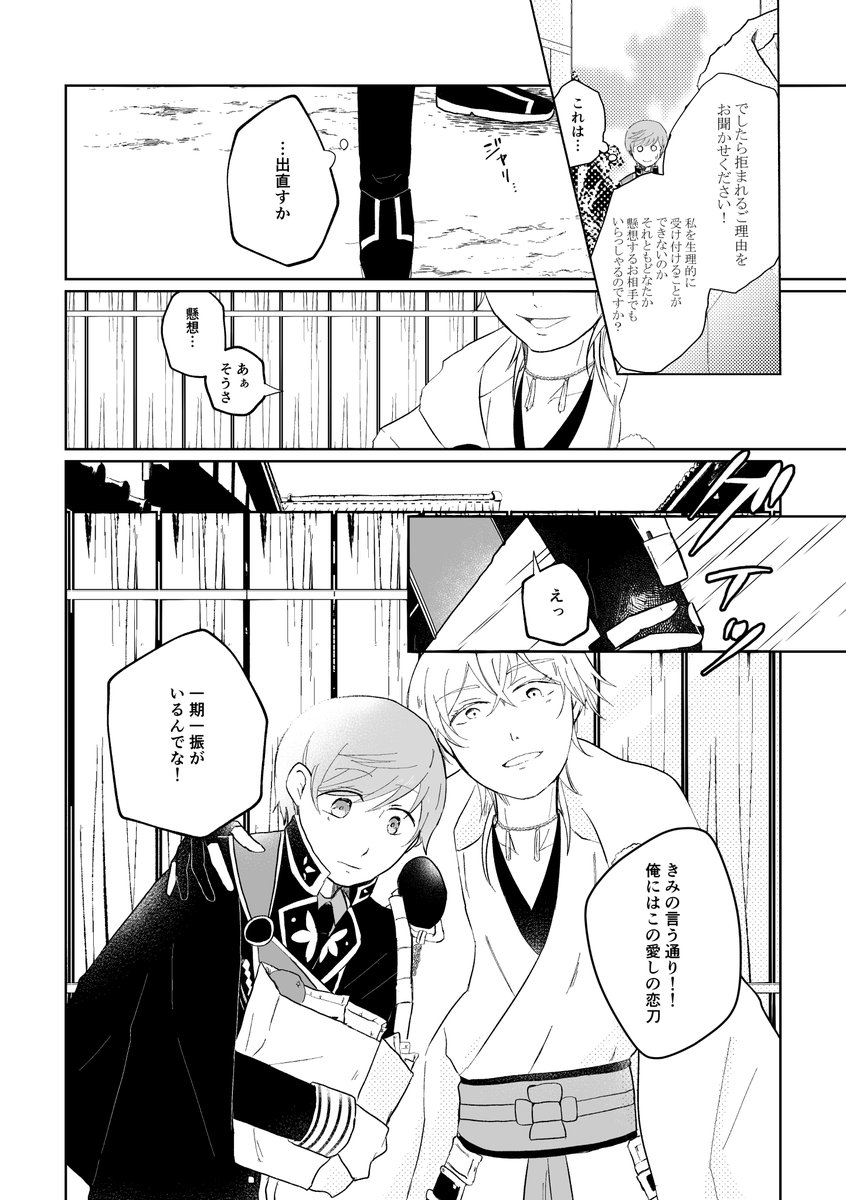 14 25 7/30 もんめ新刊サンプル。1/2 初の一期が鶴丸の仮の恋刀をすることになったお話です。 冒頭にオリキャラが少しだけ出るので ご注意ください。 23/07/29 21:16
