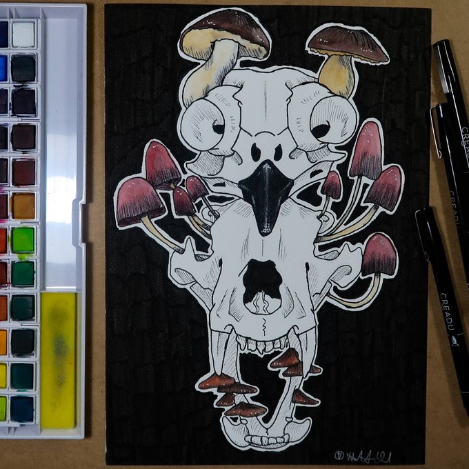 #inktober2021 #wolftober next day. Prompt from two lists: "some fungus" & "owl". Used: creadu fineliner & derwent inktense, watercolor paper from Action.