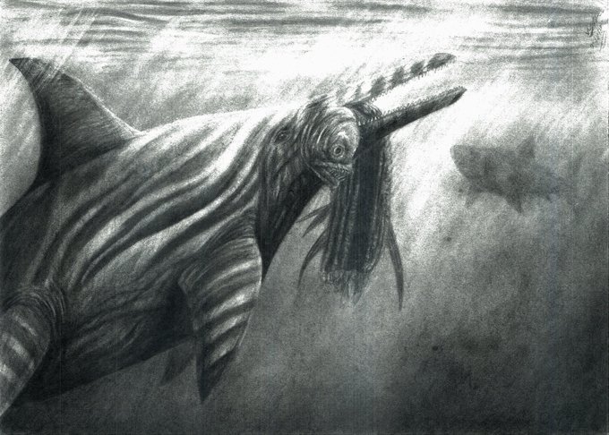 "Platypterygius" australis aka Longirostria (suggested subgenus name for this species) eating a Cooyoo while a giant cardabiodontid #shark approaches. #graphite #paleoart of Australian Toolebuc Formation fauna. #graphiteart #pencilart #Pencildrawing #pencil