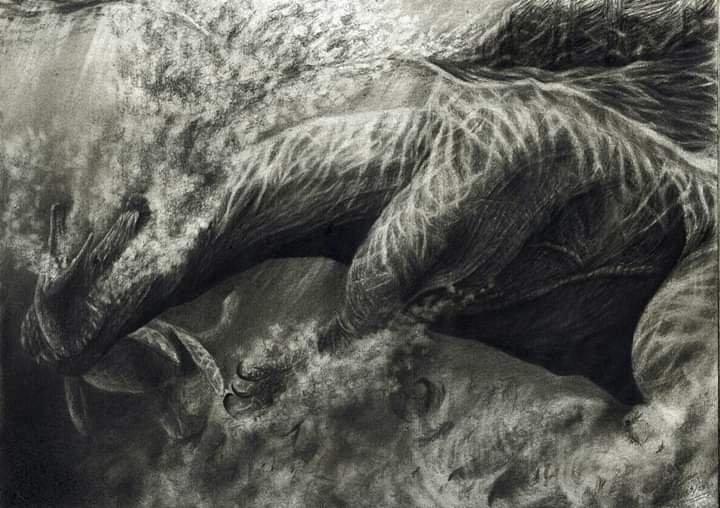 Ahhh one more #graphite #paleoart of SPINOSAURUS swimming upwards for a big breath of air #dinosaurs #dinosaur #paleontology #pencilart #pencilsketch #pencil #paleo
