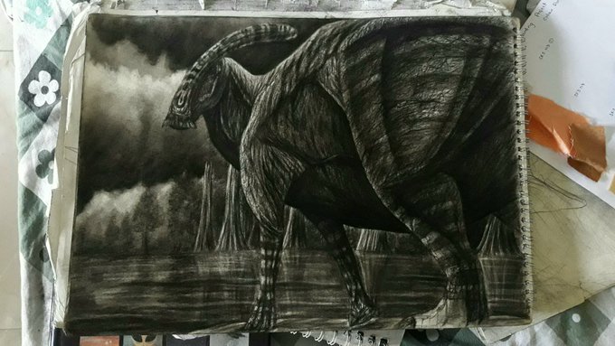 #WorkinProgress #workingfromhome Looking LIIIIKE PARASAUROLOPHUS 🥴🥴🥴🥴 is gonna be finished today. 🤭😌 #paleoart #Utah #charcoaldrawing
