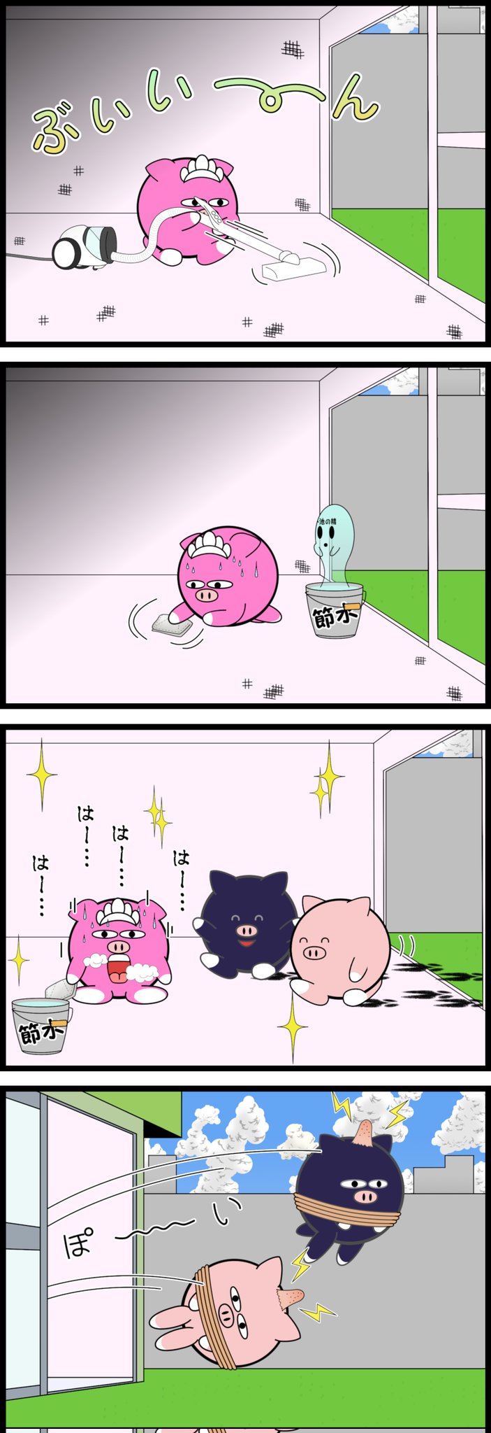 3匹のブタさん+2匹目 910本目 #4コマ #4コマ漫画 #オリジナルキャラ #cartoon #大掃除 #無神経 #どっちも #理不尽 ameblo.jp/butasan-plus/