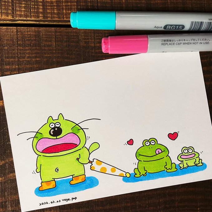 ゲコゲコッ🐾ネコちゃんもカエル色🐸 . #イラスト好きな人と繋がりたい #イラスト #イラストレーター #イラストレーション #illustration #art #drawing #絵描きさんと繋がりたい