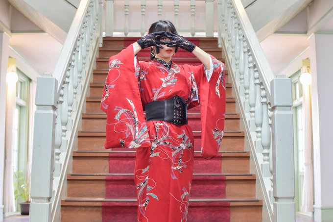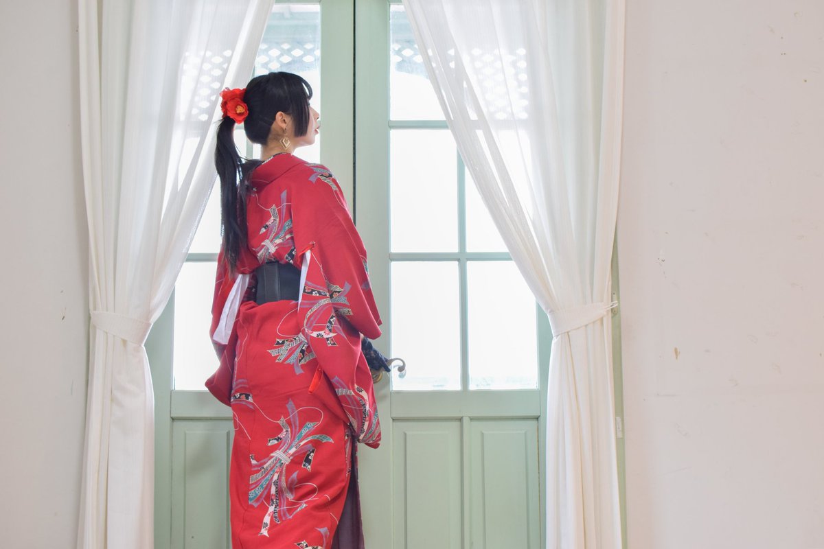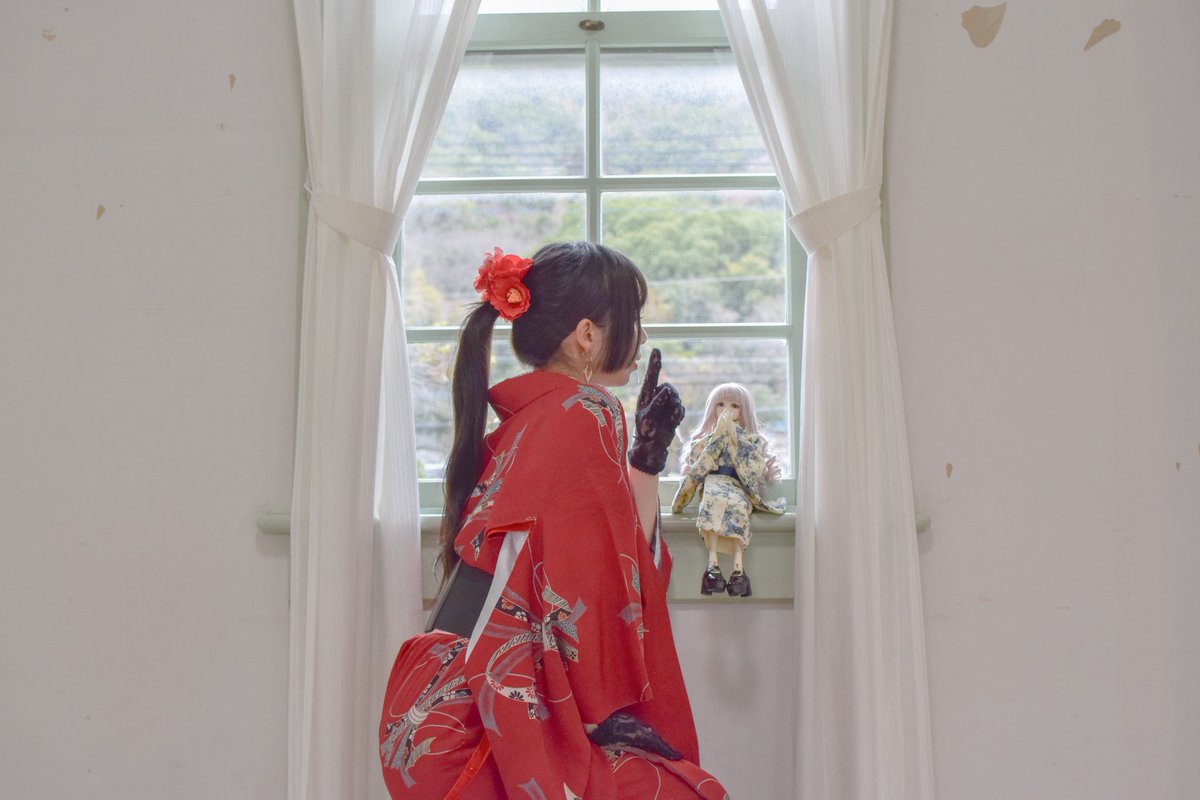 着物で推しコーデ第3弾加州清光イメージ🫰🏻💗 頭には椿と牡丹、着物はメルカリでお譲り頂いたアンティーク、例のポーズ✨ 丈少し足りないけど袖長くてかわいいから良し! 吐息まで紅に染まりました🫶🏻 #四季彩まといネイル #ドールとオーナー #ドールとセルフポートレート