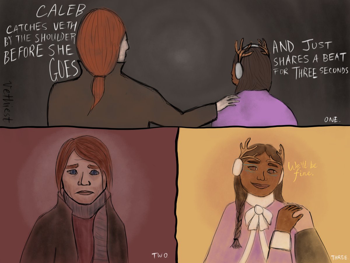 caleb&veth, c2e139. when you have to go into battle beside your best friend and you have everything and nothing to say, so you share a beat for three seconds before heading to your possible end. #criticalrole #criticalrolefanart #criticalrolespoilers #vethbrenatto #calebwidogast