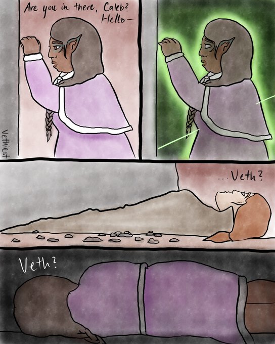 one of the best moments from c2e139. thanks to sam and matt for that perfectly chilling exchange, and of course to veth, the eternally brave. #criticalrole #criticalrolefanart #criticalrolespoilers #vethbrenatto #lucien