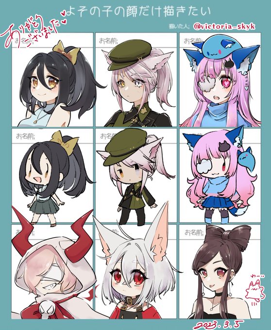 #よその子の顔だけ描きたい おまたせしました…!!🖊✨ (週末に完成とかいって無事遅刻) よその子を描く機会があまりないので、とても楽しかったです♪ せっかくなのでデフォルメも描いちゃいました✨ ありがとうございました✨ 下段3人はうちの子ですw #イラスト #illustration