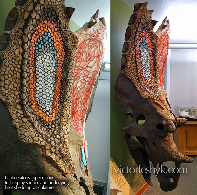 for #InternationalDinosaurDay, my life-size #Sciart #paleoart restoration of hide and blood vessels to show the probable heat-dumping function of the frill fenestrae in Utahceratops for @AlanTitus1 and @BLMUtah
