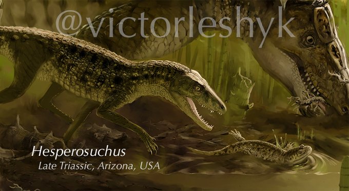 #WorldCrocodileDay Did you know that crocodile ancestors were fleet-footed land animals about the size of a greyhound? In this detail from my #paleoart #SciArt at @PetrifiedNPS , Hesperosuchus pursues a small metoposaur amphibian that tries to escape into a nearby stream