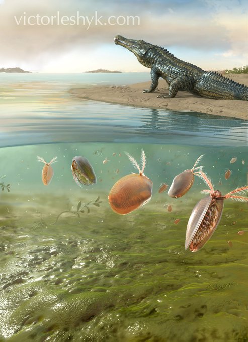 my new #Sciart #paleoart of the shallow-water microbial mat covering much of the UK in the late Triassic: a phytosaur looks skyward at the volcanic vapors from seafloor spreading that would ultimately cause havoc in marine ecosystems: southampton.ac.uk/news/2020/11/m…