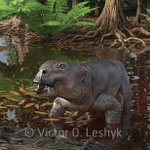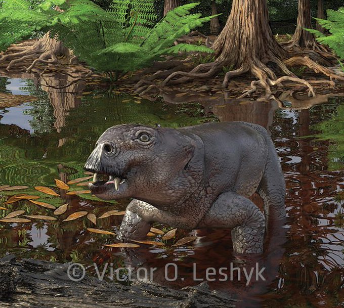 A lystrosaur slinks away from flames on a forest floor. Glad to share my new #Sciart #paleoart to depict research by @palaeomays et al: evidence of a "burnout" phase with widespread wildfires toward the end of the Permian, even in typically wet areas. pubs.geoscienceworld.org/sepm/palaios/a….