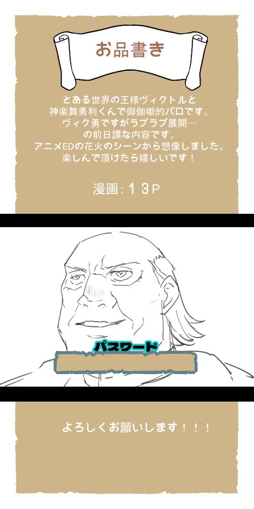 #webオンリー氷上舞踏会 開催おめでとうございます! 参加させて頂きます☺️ 【AカモメV×Y: お8】にて短いですが無配漫画展示します。 プライベッターでパスワード制公開です。 パスは会場でご確認お願いします。 お品書きギリギリですみません…😭 よろしくお願いします~!⛸️⛸️✨✨✨