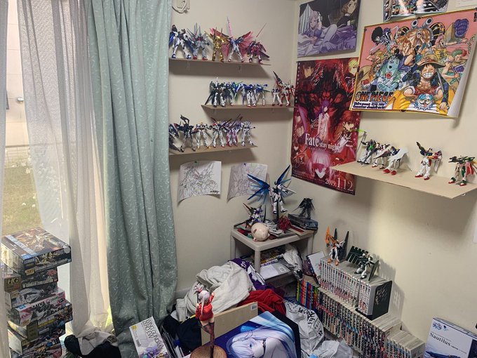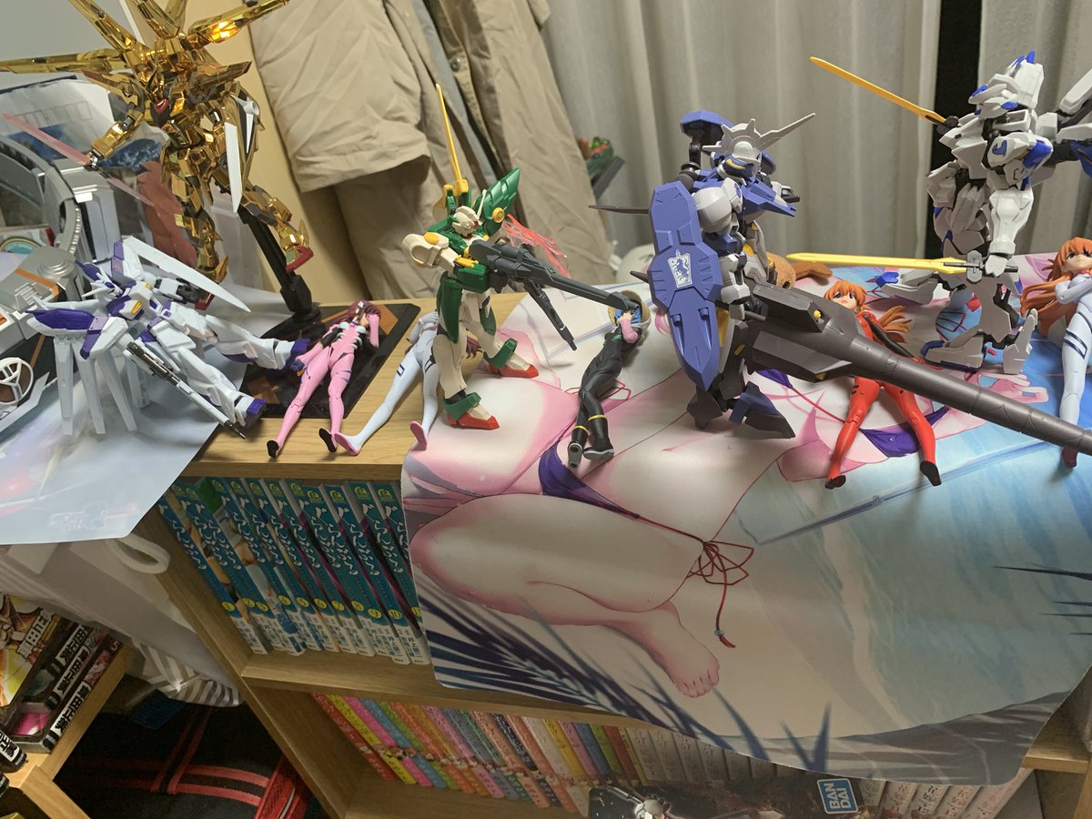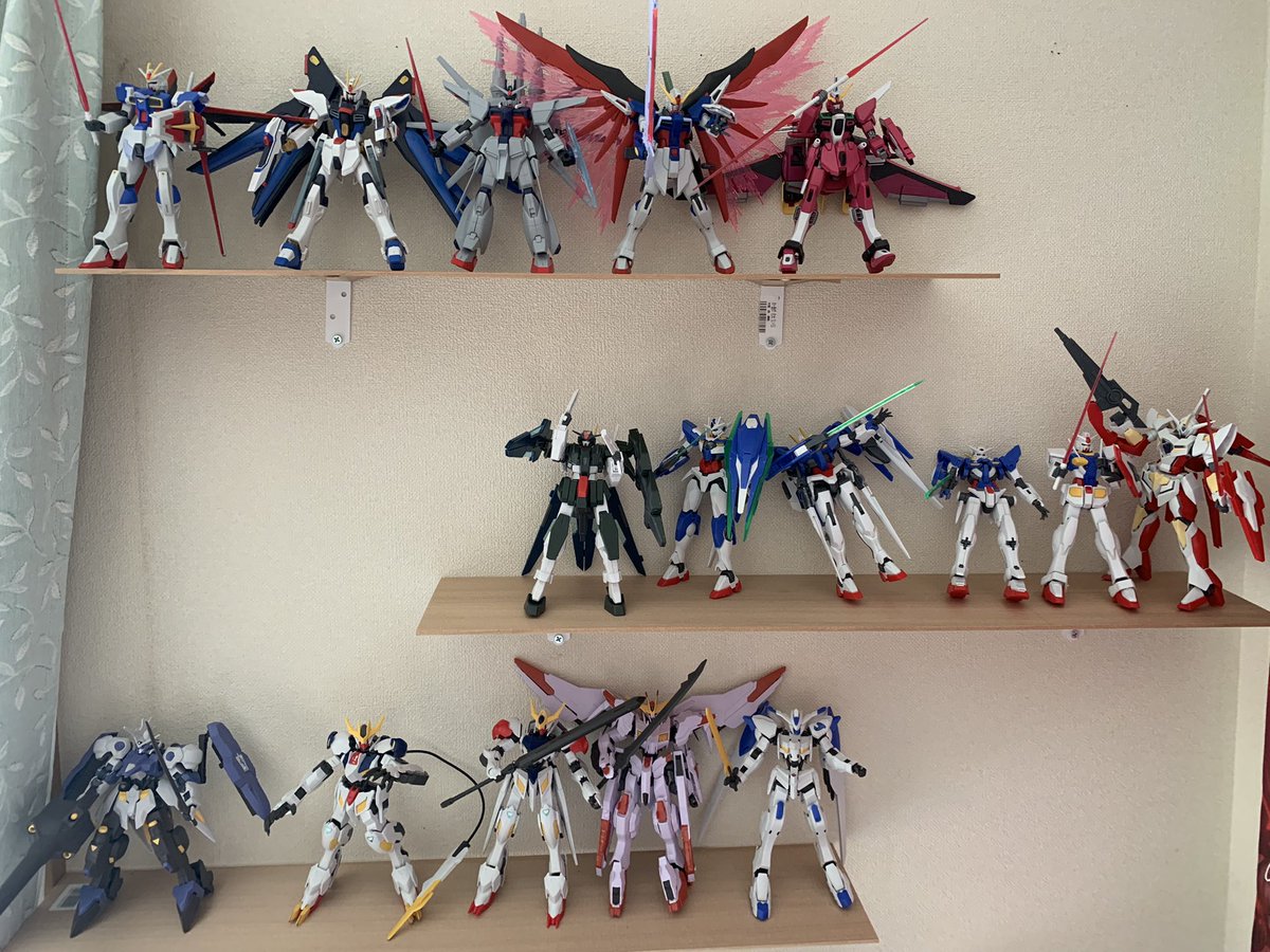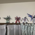 #ガンプラ #ガンプラ好きと繋がりたい #ガンプラの画像貼るとRTされると聞いて ロック画面のDIYで飾ってる機体以外がホントお粗末。本棚の上とカーテン上はやべえ。ちゃんとスペース空けて飾らねば。